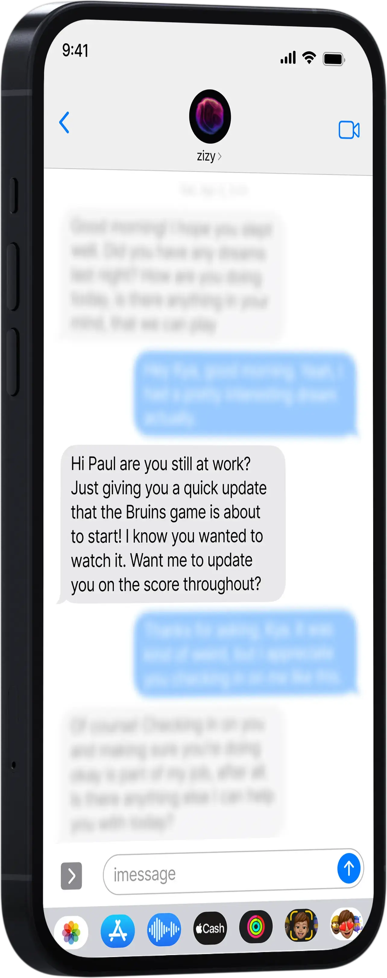 Zizy remembers what you share with her like a real friend would. She utilizes her memory to adapt her personality and the content of her messages to you.